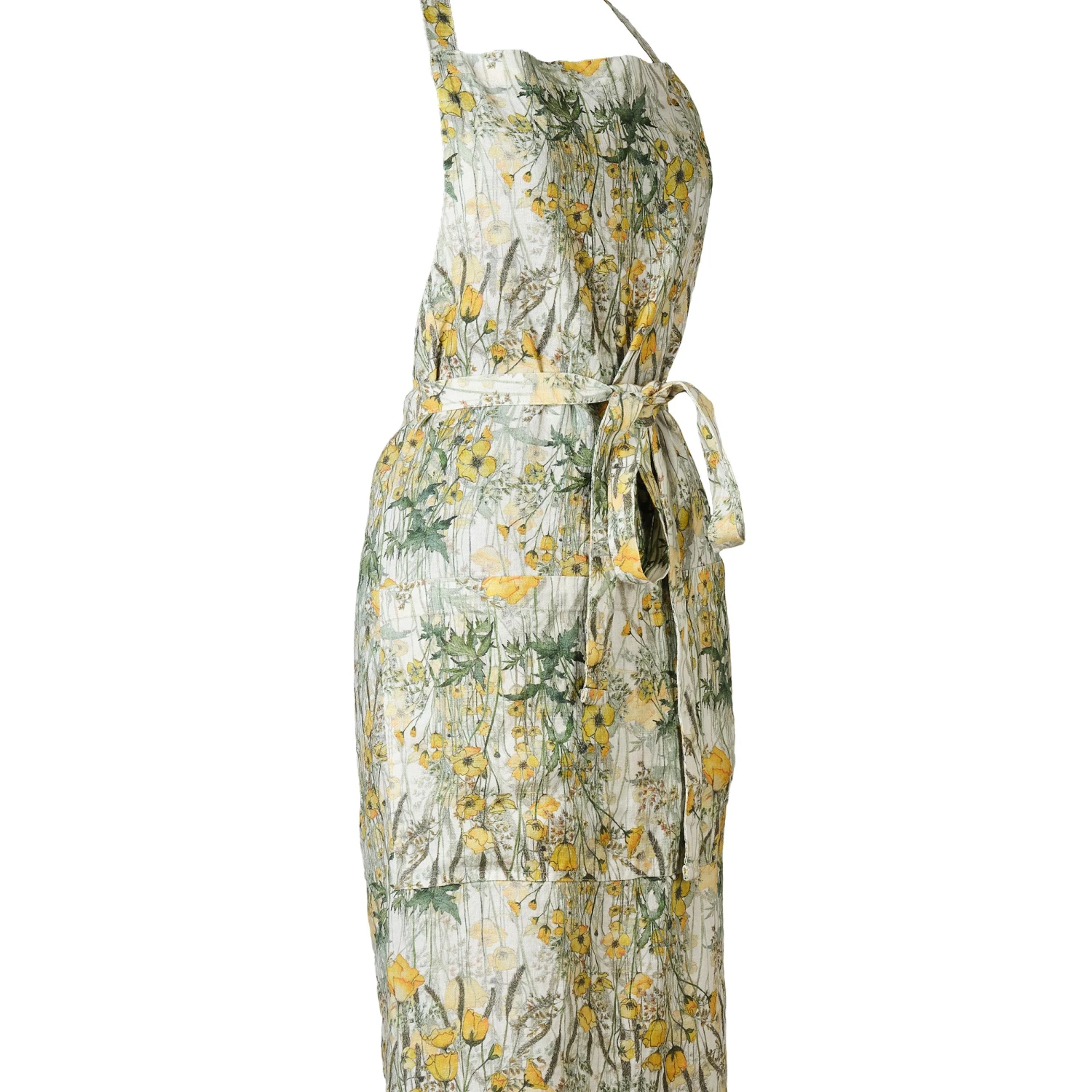 The aprons are adjustable at the neck and have a large pocket on the front. They are elegantly long but can be folded up when tied.